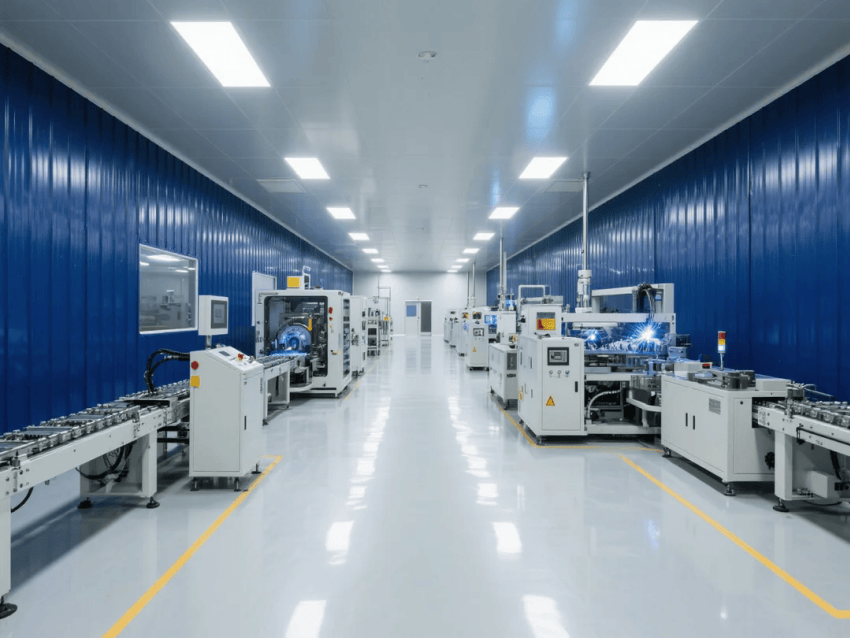 車(chē)間采用模塊化潔凈室結(jié)構(gòu),墻體采用50mm厚深藍(lán)抗菌彩鋼板,接縫處采用圓弧處理工藝。自動(dòng)化沖壓線與激光焊接工作站呈U型交替布局,工作站間設(shè)置深灰不銹鋼傳遞窗,確保物料流轉(zhuǎn)潔凈度。吊頂系統(tǒng)配置FFU高效過(guò)濾單元,維持≥20次/h換氣次數(shù),氣流組織采用頂送側(cè)回模式。