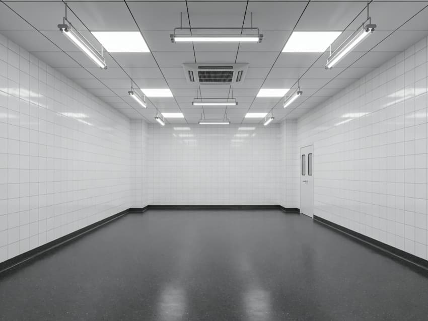 車間內(nèi)部施工工藝凸顯耐腐潔凈特性:地面采用深灰色重防腐環(huán)氧自流平工藝,經(jīng)基層噴砂處理、防腐底漆涂刷、環(huán)氧砂漿找平、自流平罩面四道關(guān)鍵工序,表面平整度誤差≤1mm/m,耐酸堿、耐有機(jī)溶劑腐蝕,附著力達(dá)2.0MPa以上;墻面采用白色食品級(jí)潔凈抗菌涂層施工,推行無(wú)縫拼接技術(shù),陰陽(yáng)角采用R50圓弧倒角工藝,杜絕積塵死角,涂層硬度達(dá)2H,可耐受高頻次消殺。