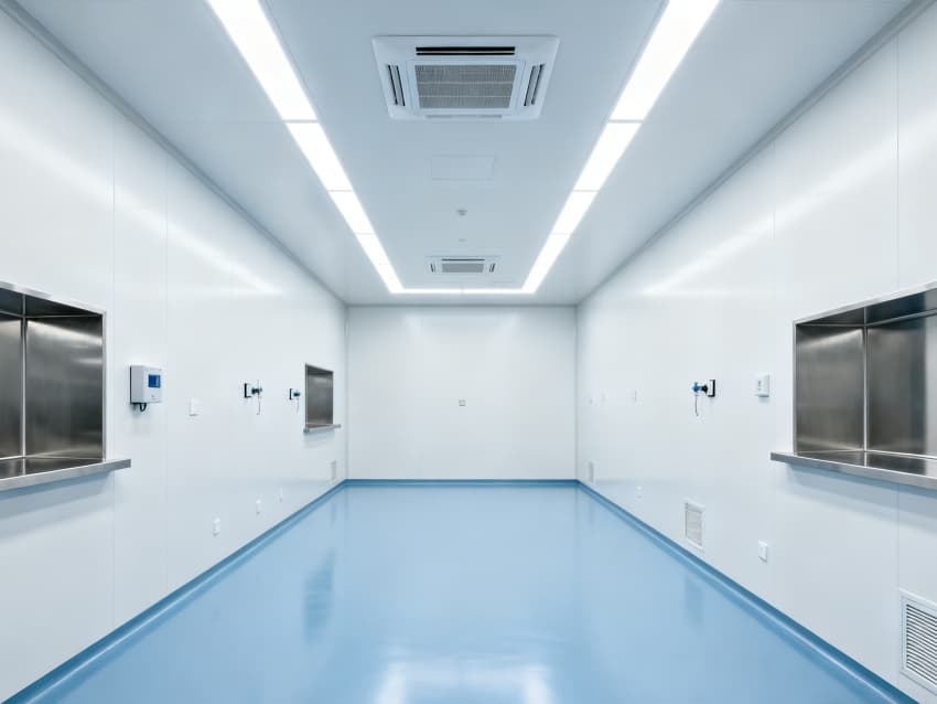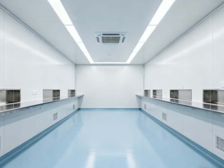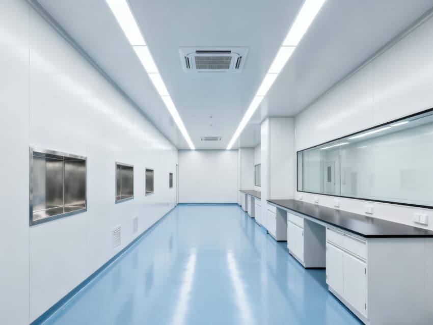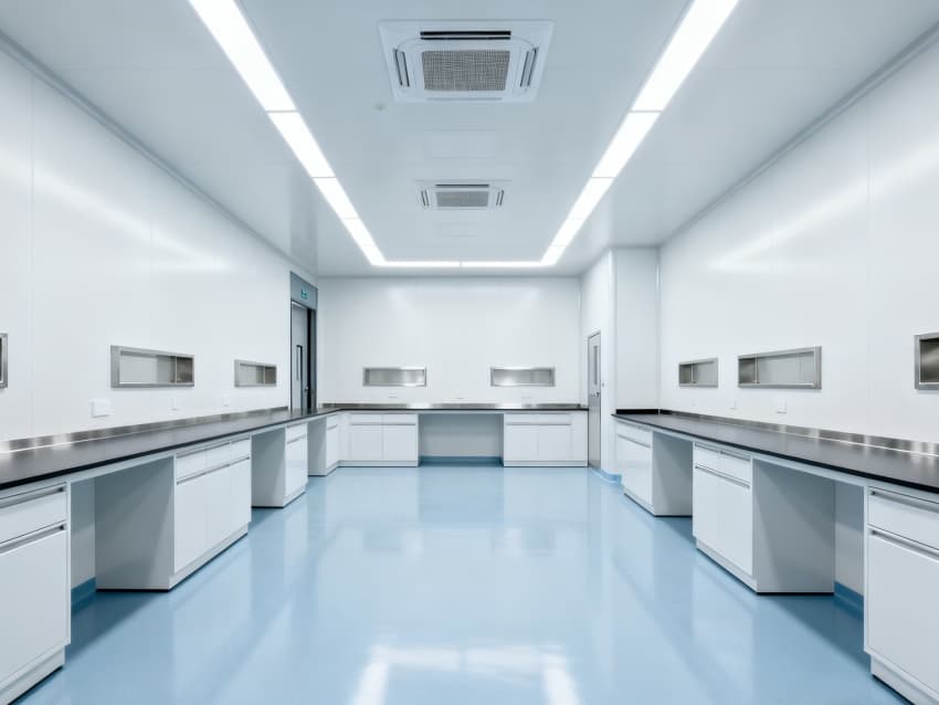內(nèi)部6個(gè)實(shí)驗(yàn)室均為無(wú)設(shè)備空曠布局,按萬(wàn)級(jí)潔凈標(biāo)準(zhǔn)建設(shè):地面鋪設(shè)無(wú)縫抗菌環(huán)氧自流平,墻面采用食品級(jí)不銹鋼潔凈墻板,陰陽(yáng)角做R40圓弧處理杜絕積塵死角;柱網(wǎng)間距設(shè)為7.5米,預(yù)留實(shí)驗(yàn)臺(tái)、精密檢測(cè)設(shè)備安裝點(diǎn)位及運(yùn)維通道;頂部整合高效新風(fēng)過(guò)濾系統(tǒng)、恒溫恒濕裝置與防眩光LED照明,所有管線暗藏于吊頂內(nèi),最大化釋放空間高度與視野;實(shí)驗(yàn)室間通過(guò)通透玻璃隔斷銜接,進(jìn)一步強(qiáng)化整體空曠感,為藥物合成、質(zhì)量檢測(cè)等核心研發(fā)環(huán)節(jié)提供安全、潔凈的專屬環(huán)境。
