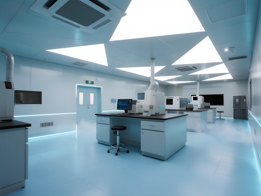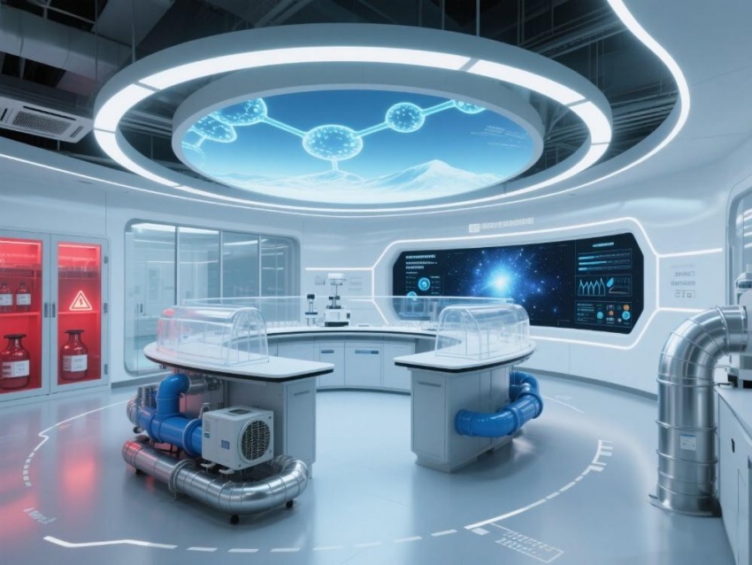 本實驗室以"絕對環(huán)境控制"為核心設(shè)計理念,整體采用冰川藍與鈦白灰的漸變配色。墻面嵌入式環(huán)境參數(shù)監(jiān)測屏實時流動著翡翠綠數(shù)據(jù)流,與頂棚矩陣排列的微孔送風口形成科技韻律。核心實驗區(qū)采用圓弧形防結(jié)露玻璃隔斷,內(nèi)置百級潔凈層流罩。地面鋪設(shè)防靜電陶瓷鋼板,接縫處嵌入LED環(huán)境達標指示燈。設(shè)備區(qū)裸露的銀色保溫管道與藍色冷媒管構(gòu)成工業(yè)美學展陳,智能除濕機組通過半透明外殼展示內(nèi)部冷凝過程。數(shù)據(jù)中控室配備270°曲面監(jiān)控屏,懸浮粒子濃度以動態(tài)星云圖呈現(xiàn)??臻g通過嚴謹?shù)膸缀畏指钆c流體力學曲線結(jié)合,在極致環(huán)境控制要求下,打造出兼具科研嚴肅性與星際艙未來感的頂級實驗環(huán)境。