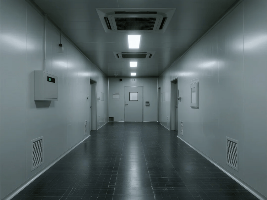 地面系統(tǒng):深灰鋁合金防靜電格柵地板,開放率≥60%,電阻值10^4~10^6Ω,下方設(shè)置2米深架空層,集成管線與FFU回風(fēng)系統(tǒng);