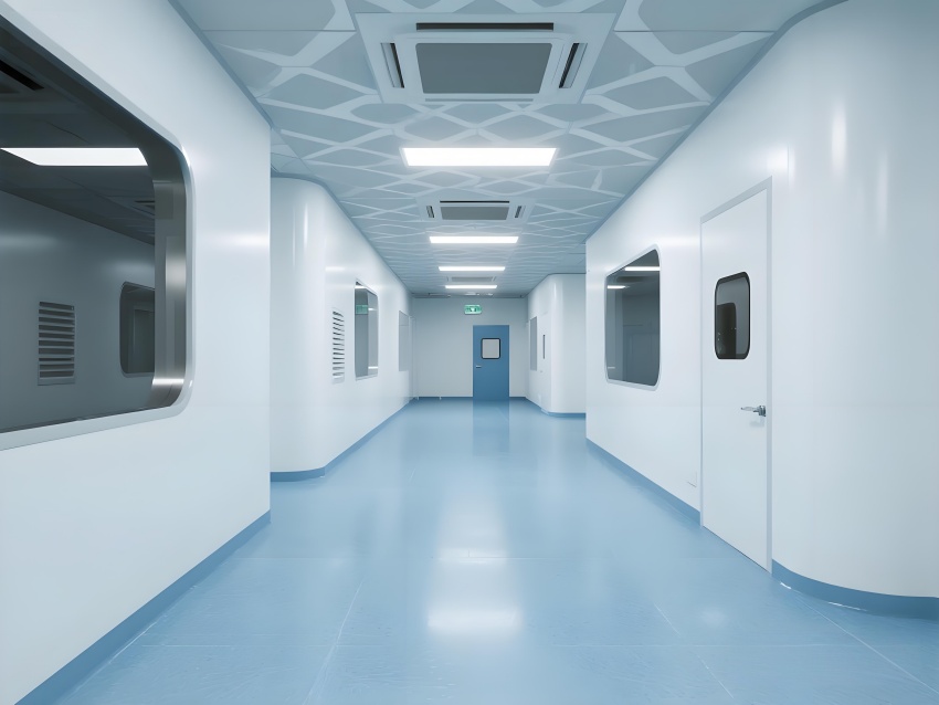 本車(chē)間空間以冰川藍(lán)與鈦白為主色調(diào),弧形墻角與無(wú)縫地坪構(gòu)成流暢的潔凈界面,頂部蜂窩狀FFU陣列形成科技感天花肌理。灌裝區(qū)透明亞克力防護(hù)罩展示自動(dòng)化生產(chǎn)線運(yùn)作,配合層流工作臺(tái)的紅色氣流可視化設(shè)計(jì),強(qiáng)化無(wú)菌核心概念。功能模塊通過(guò)地面灰色導(dǎo)視帶串聯(lián),設(shè)備區(qū)的鏡面不銹鋼與控制面板的藍(lán)色背光形成冷調(diào)光效。玻璃觀察窗嵌入電子壓差計(jì),走廊的漸變光環(huán)境引導(dǎo)系統(tǒng)在滿足GMP動(dòng)態(tài)監(jiān)測(cè)要求的同時(shí),營(yíng)造出未來(lái)實(shí)驗(yàn)室般的專業(yè)氛圍,緩解員工長(zhǎng)時(shí)間密閉作業(yè)的疲勞感。