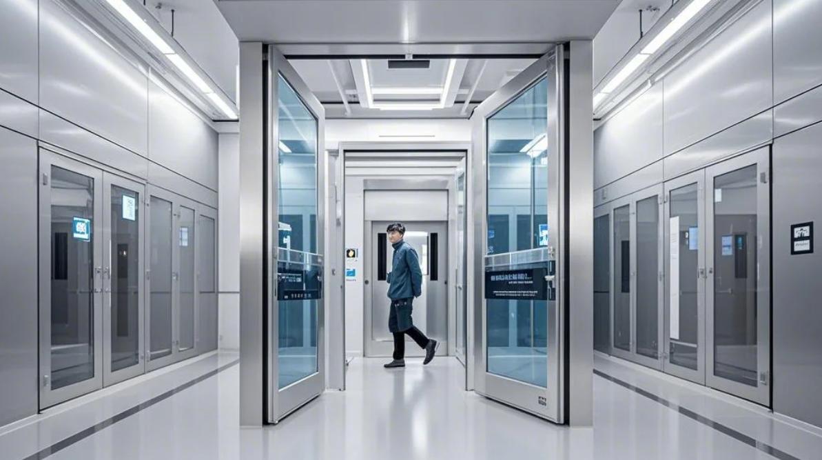 半導(dǎo)體晶圓廠潔凈車間,工業(yè)級無塵環(huán)境設(shè)計。更衣區(qū)設(shè)置環(huán)氧樹脂自流平地坪,墻面嵌入正壓送風(fēng)百葉,紫外線消毒衣柜線性排列。風(fēng)淋通道配備360度旋轉(zhuǎn)氣流噴嘴,頂部