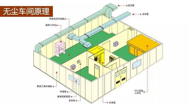 達到要求的這樣一個穩(wěn)定生產(chǎn)環(huán)境即稱為無塵車間,也叫潔凈廠房、潔凈室(Clean Room)、無塵室。無論外部條件怎么變化,其室內(nèi)均能維持符合原先設(shè)定要求的潔凈度、溫濕度及壓力等性能。