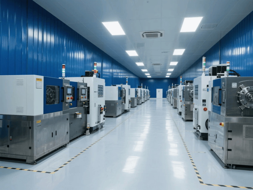 智能控制系統(tǒng)集成環(huán)境監(jiān)測(cè)、設(shè)備聯(lián)動(dòng)與生產(chǎn)看板,深藍(lán)墻面上嵌裝LED數(shù)據(jù)顯示屏,實(shí)時(shí)反饋工藝參數(shù)。照明系統(tǒng)采用600x600mm潔凈平板燈,色溫5000K,重點(diǎn)工位增設(shè)局部補(bǔ)光。整體設(shè)計(jì)通過冷色調(diào)的工業(yè)美學(xué)與自動(dòng)化產(chǎn)線融合,構(gòu)建高效、精準(zhǔn)的現(xiàn)代化注塑生產(chǎn)空間。