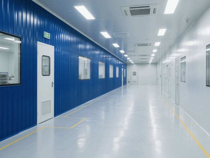 車間采用模塊化潔凈結(jié)構(gòu),50mm厚深藍(lán)抗菌彩鋼板墻體搭配圓弧收邊工藝,確保無塵死角。自動(dòng)化注塑機(jī)與機(jī)械臂工作站呈流水線布局,設(shè)備區(qū)采用淺灰不銹鋼圍擋,與深藍(lán)墻體形成鮮明對(duì)比。吊頂系統(tǒng)配置FFU高效過濾單元,維持≥25次/h換氣次數(shù),氣流組織采用頂送側(cè)回模式,確保溫濕度與潔凈度穩(wěn)定。