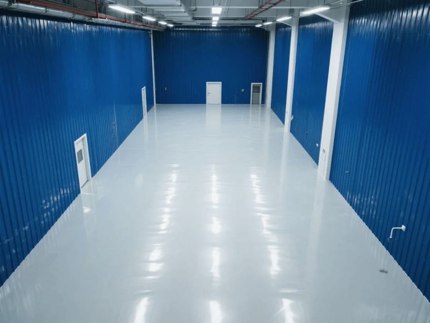 本方案以工業(yè)科技風(fēng)為設(shè)計(jì)導(dǎo)向,打造符合ISO14644-1Class7標(biāo)準(zhǔn)的智能化注塑生產(chǎn)環(huán)境??臻g主體采用深藍(lán)色彩鋼板墻體與淺灰防靜電環(huán)氧自流平地坪,形成冷峻而富有科技感的視覺層次。地面系統(tǒng)電阻值穩(wěn)定控制在10^6~10^9Ω,兼具防靜電與耐磨特性,滿足精密注塑工藝需求。