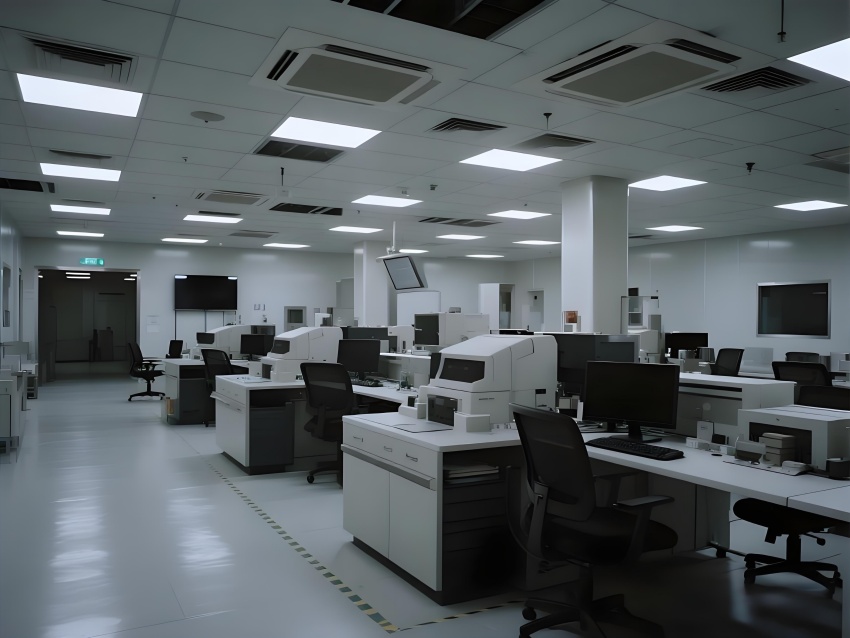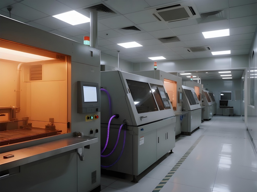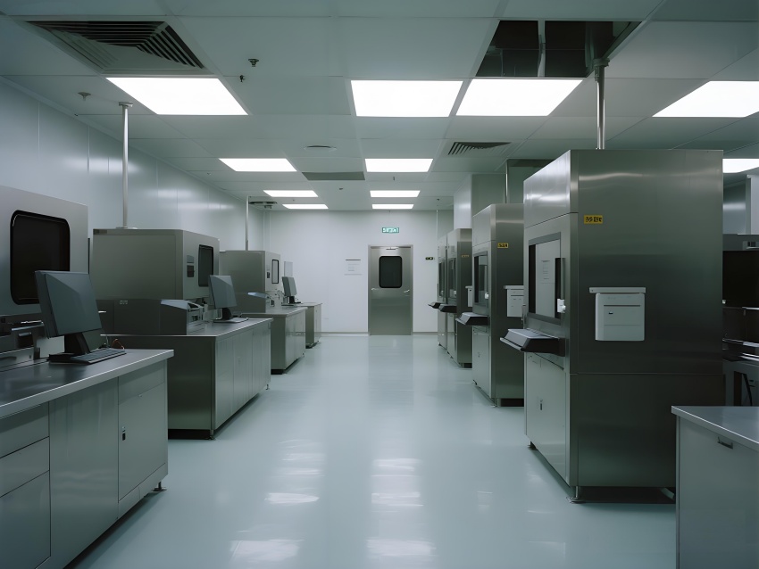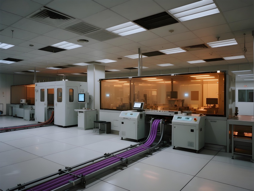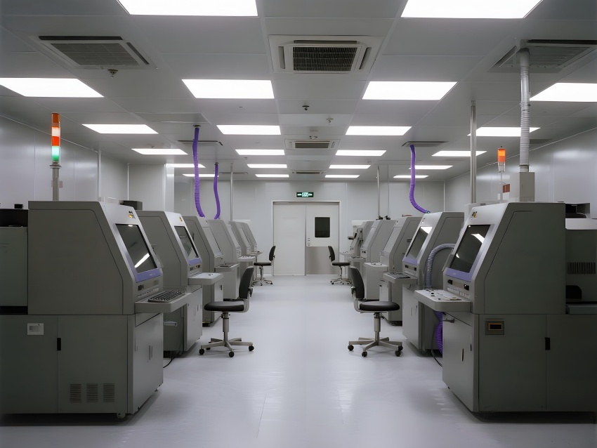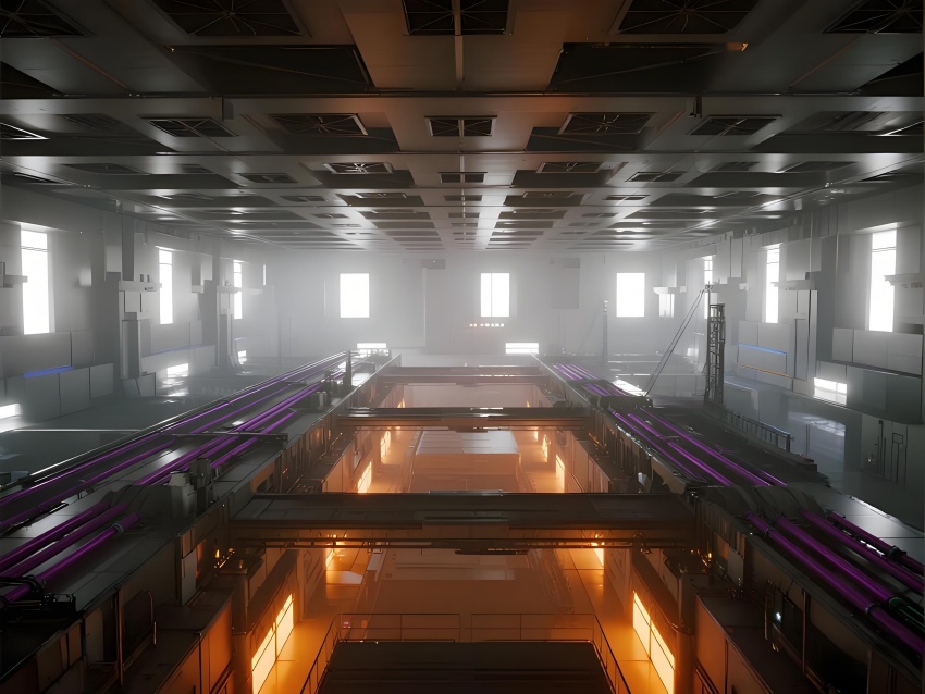 本芯片廠采用"硅基未來(lái)主義"設(shè)計(jì)風(fēng)格,將納米級(jí)制造的精密感轉(zhuǎn)化為宏大的工業(yè)美學(xué)。空間以鈦銀與深空灰為主色調(diào),光刻區(qū)的琥珀色防霧照明與蝕刻區(qū)的冷紫工藝氣體管道形成科技光譜。高架地板下的藍(lán)色氣流指示燈模擬集成電路紋路,天花板的矩陣式FFU單元如晶圓陣列般規(guī)整。透明設(shè)備艙內(nèi)機(jī)械臂的精準(zhǔn)運(yùn)動(dòng)軌跡,與墻面懸浮的晶圓生產(chǎn)數(shù)據(jù)流構(gòu)成動(dòng)態(tài)敘事。防靜電涂層的金屬質(zhì)感表面反射出潔凈室的無(wú)限縱深感,關(guān)鍵區(qū)的紅色激光定位光幕則強(qiáng)化半導(dǎo)體制造的危險(xiǎn)與精確。通過(guò)嚴(yán)格的功能色彩編碼(黃-光刻/紫-蝕刻/藍(lán)-檢測(cè))和極簡(jiǎn)的無(wú)縫設(shè)計(jì),在滿足ISO14644Class1標(biāo)準(zhǔn)的同時(shí),塑造出如同微觀芯片放大至建筑尺度的震撼視覺(jué)隱喻。