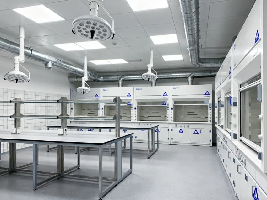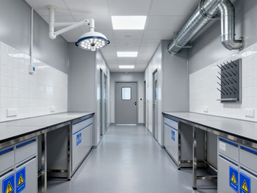 本生化研究實(shí)驗(yàn)室凈化工程嚴(yán)格遵循ISO7級(jí)潔凈標(biāo)準(zhǔn),將實(shí)驗(yàn)空間科學(xué)劃分為四大核心功能區(qū)域:樣品前處理區(qū)配備通風(fēng)櫥、震蕩儀等預(yù)處理設(shè)備,采用負(fù)壓設(shè)計(jì)防止交叉污染;試劑配制區(qū)設(shè)有獨(dú)立的天平室與超純水系統(tǒng),通過溫濕度智能調(diào)控系統(tǒng)將環(huán)境參數(shù)穩(wěn)定控制在±1℃與45%-60%RH;精密檢測區(qū)配置防震臺(tái)與電磁屏蔽裝置,可滿足高效液相色譜、質(zhì)譜儀等精密儀器的運(yùn)行需求;無菌操作區(qū)配備層流凈化工作臺(tái)與生物安全柜,配合動(dòng)態(tài)浮游菌監(jiān)測系統(tǒng),確保實(shí)驗(yàn)環(huán)境達(dá)到百級(jí)潔凈度標(biāo)準(zhǔn)。各功能區(qū)通過氣密式緩沖間與機(jī)械互鎖傳遞窗形成物理隔離,構(gòu)建起三級(jí)防護(hù)屏障。在保障蛋白質(zhì)分離純化、核酸提取擴(kuò)增等常規(guī)實(shí)驗(yàn)高效開展的同時(shí),還專門設(shè)計(jì)了酶活性檢測專用恒溫恒濕實(shí)驗(yàn)室,采用獨(dú)立的凈化空調(diào)系統(tǒng)與UPS不間斷電源,可支持對(duì)環(huán)境參數(shù)高度敏感的高精度研究項(xiàng)目。此外,工程特別設(shè)置雙通道應(yīng)急處理系統(tǒng),包含緊急洗眼裝置、消防噴淋系統(tǒng)與防化物資儲(chǔ)備間,配合逃生路線熒光標(biāo)識(shí)與應(yīng)急照明系統(tǒng),全方位保障實(shí)驗(yàn)人員安全與科研數(shù)據(jù)完整。?