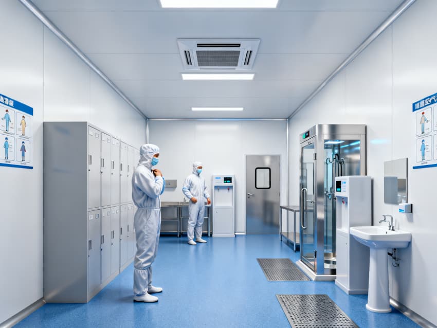 凈化配套設(shè)計全面:藍(lán)色地面具備抗菌、易消殺特性,配合地面導(dǎo)坡設(shè)計加速清潔排水,減少污漬殘留;白色墻面采用無縫抗菌涂層,消除清潔死角,降低微生物附著風(fēng)險;全車間劃分獨(dú)立凈化分區(qū),通過壓差控制預(yù)留設(shè)計隔絕不同潔凈等級區(qū)域,人流、物流通道分離避免交叉污染,全方位保障無菌生產(chǎn)環(huán)境穩(wěn)定達(dá)標(biāo)。