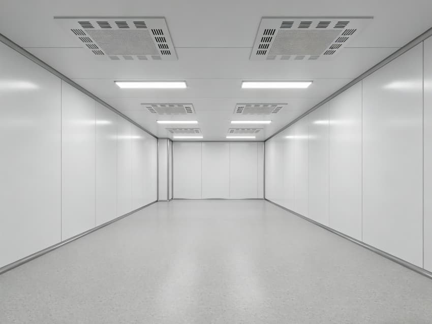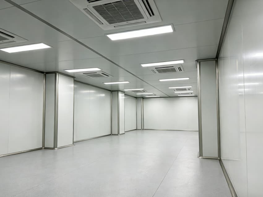 本次呈現(xiàn)的電子精密器件工廠車間以“高精度施工、高潔凈適配”為核心,融合多項(xiàng)專業(yè)施工工藝,車間內(nèi)部施工工藝凸顯精密特性:地面采用淺灰色環(huán)氧防靜電自流平工藝,經(jīng)基層拋丸處理、界面劑涂刷、環(huán)氧砂漿找平、自流平罩面四道核心工序,表面平整度誤差≤0.8mm/m,防靜電性能達(dá)10?-10?Ω;墻面采用白色潔凈抗菌涂層施工,推行無縫拼接技術(shù),陰陽角采用R50圓弧倒角工藝,杜絕積塵死角,涂層硬度達(dá)2H以上,耐受頻繁清潔。