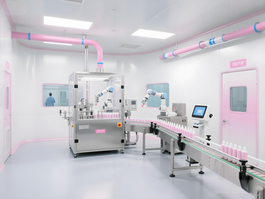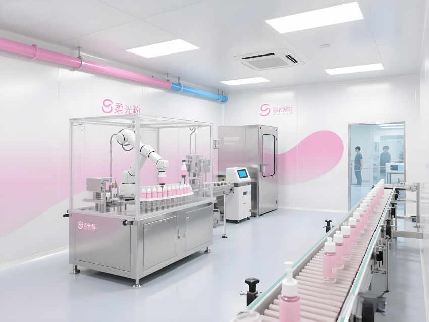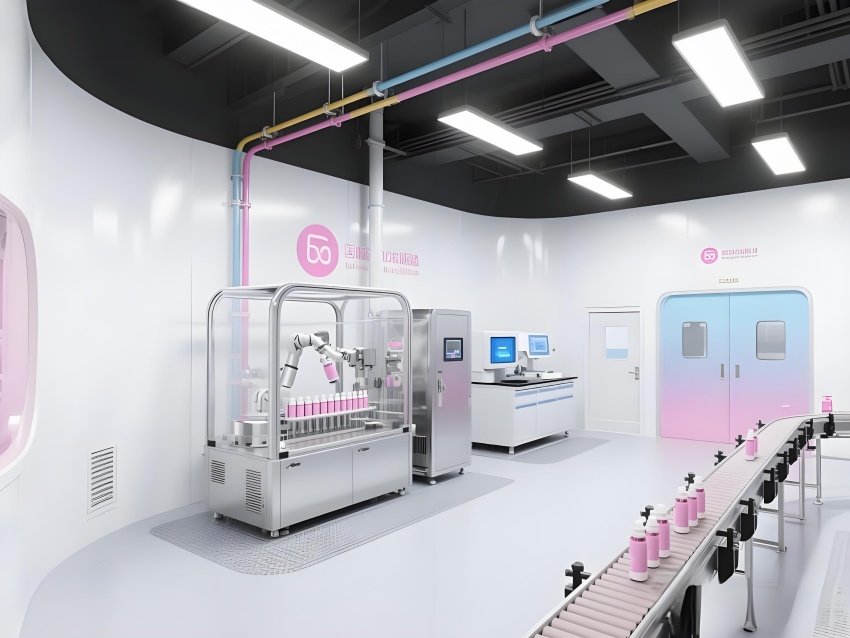 本車間以“科技感純凈美學”為設(shè)計語言,將化妝品行業(yè)的精致基因融入工業(yè)空間。純白主色調(diào)搭配品牌標志性的柔光粉點綴,墻面圓弧過渡的彩鋼板與地面淺灰導靜電地板構(gòu)成潔凈基底。核心灌裝區(qū)透明層流罩內(nèi),機械臂精準抓取瓶體灌裝,冷銀色設(shè)備與粉色功能標識形成視覺對比。頂棚均勻分布的LED平板燈在乳化區(qū)投下無影光效,原料輸送管道通過色環(huán)編碼清晰區(qū)分。質(zhì)檢實驗室的藍光檢測儀與包裝區(qū)高速傳送帶上的產(chǎn)品流,共同構(gòu)建高效生產(chǎn)韻律。人員通道的智能風淋室采用漸變色玻璃,科技感與人性化并存。整體空間通過嚴格的功能分區(qū)與柔和的色彩管理,打造符合國際標準的化妝品智造殿堂。