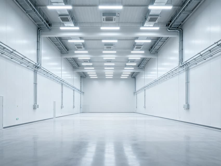 內(nèi)部6個生產(chǎn)車間均為無設(shè)備空曠布局,按工業(yè)級潔凈與承重標(biāo)準(zhǔn)建設(shè):地面鋪設(shè)耐磨防靜電環(huán)氧地坪,墻面采用白色環(huán)保潔凈墻板,陰陽角做圓弧處理減少積塵;柱網(wǎng)間距達(dá)10米,預(yù)留設(shè)備安裝與物流通道空間;頂部整合恒溫恒濕新風(fēng)系統(tǒng)與節(jié)能LED照明,管線暗藏于吊頂內(nèi),避免空間雜亂;車間之間通過通透玻璃隔斷銜接,進(jìn)一步強化整體空曠感,為新能源產(chǎn)品規(guī)?;a(chǎn)、柔性產(chǎn)線調(diào)整提供高效、潔凈的空間支撐。