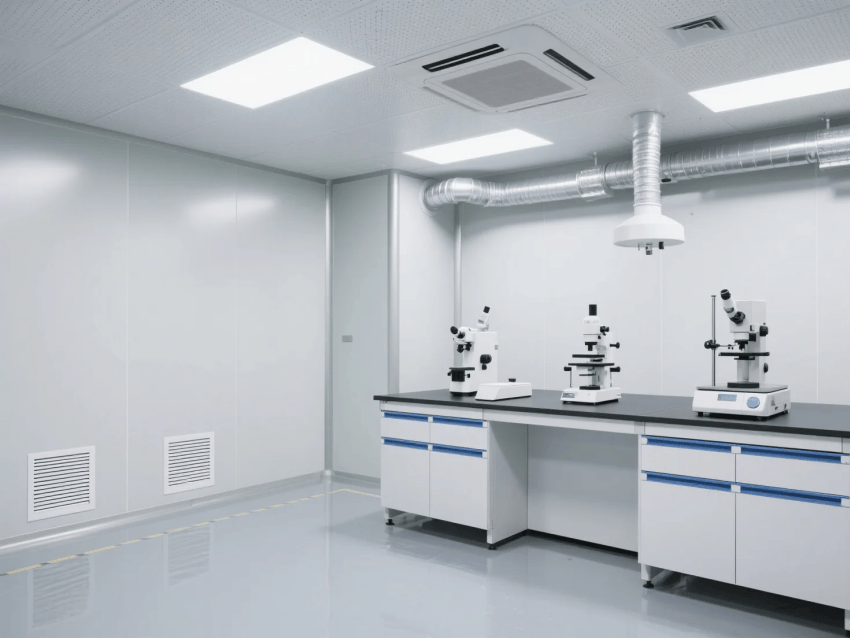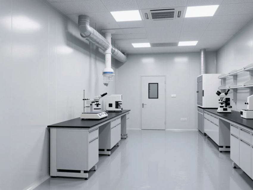 本方案采用高級(jí)灰與純白作為主色調(diào),打造嚴(yán)謹(jǐn)專業(yè)的實(shí)驗(yàn)環(huán)境。墻面選用50mm厚聚氨酯保溫彩鋼板,表面覆有抗菌涂層,接縫處采用無縫焊接工藝處理。地面鋪設(shè)2mm厚環(huán)氧自流平地坪,具有優(yōu)異的耐化學(xué)腐蝕性能,灰白相間的分區(qū)標(biāo)識(shí)既美觀又實(shí)用。