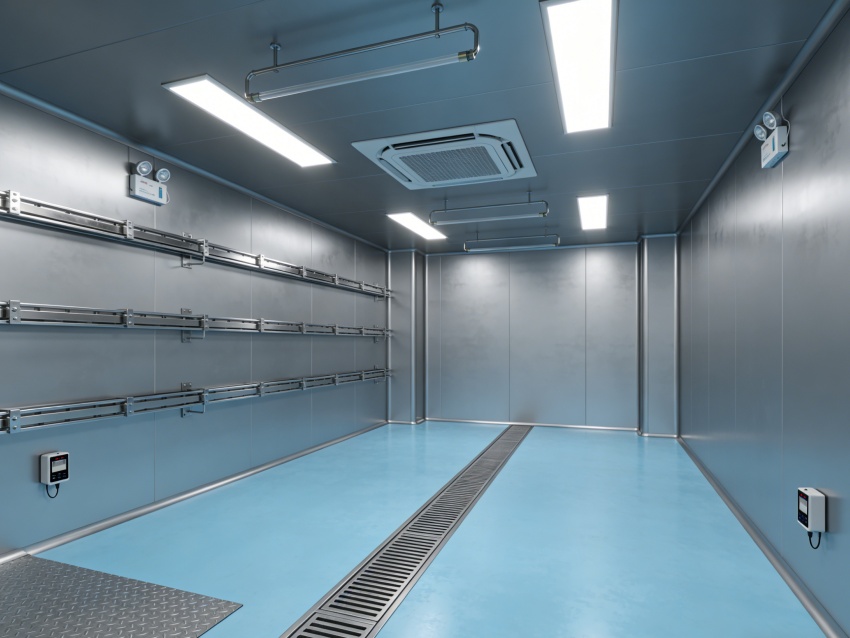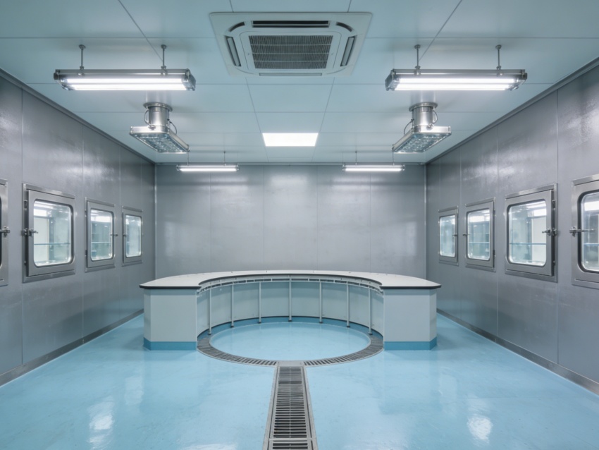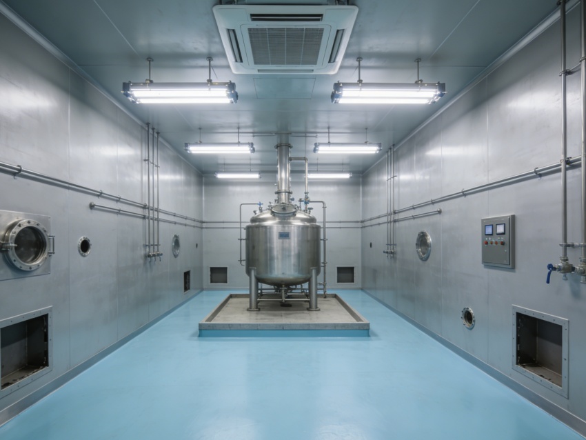 車間內(nèi)部統(tǒng)一采用淺藍(lán)色抗菌防靜電地坪搭配灰色無縫工業(yè)級墻面。淺藍(lán)色地面選用食品級環(huán)氧材質(zhì),具備優(yōu)異的耐腐蝕性與易消殺性能,可耐受各類清潔試劑,同時(shí)有效規(guī)避靜電干擾;灰色墻面采用抗菌涂層無縫拼接,搭配圓弧墻角設(shè)計(jì),徹底杜絕積塵死角,有效降低微生物滋生風(fēng)險(xiǎn),全面適配無菌環(huán)境嚴(yán)苛管控需求。