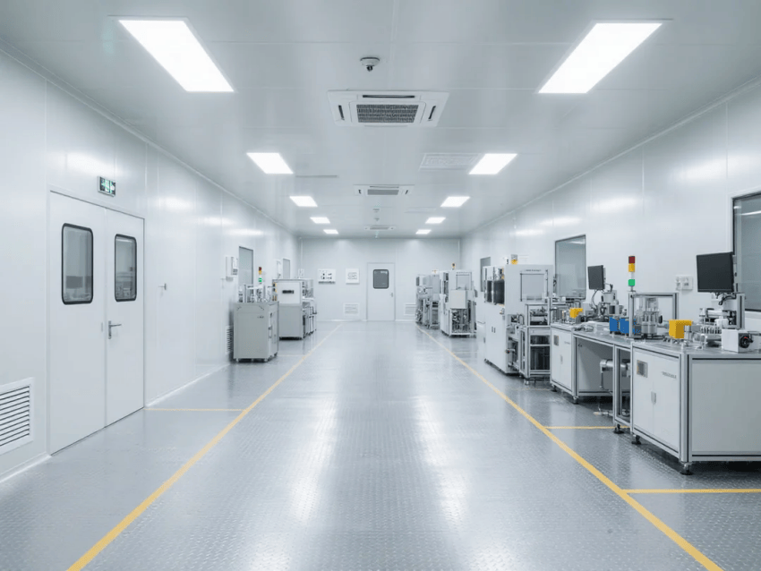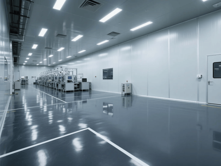 醫(yī)療器械生產(chǎn)車間內(nèi)部采用灰色地面與白色墻壁的簡(jiǎn)約統(tǒng)一風(fēng)格,嚴(yán)格契合GMP潔凈生產(chǎn)規(guī)范,全方位保障醫(yī)療器械生產(chǎn)的無(wú)菌安全與合規(guī)性?;疑孛孢x用醫(yī)用級(jí)抗菌環(huán)氧自