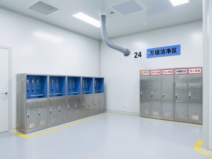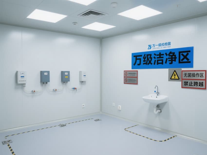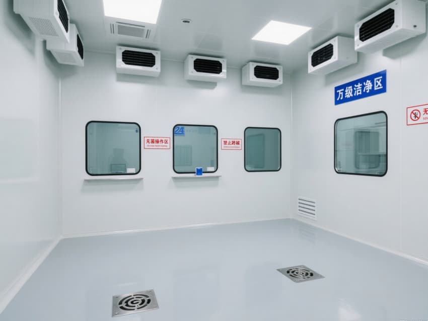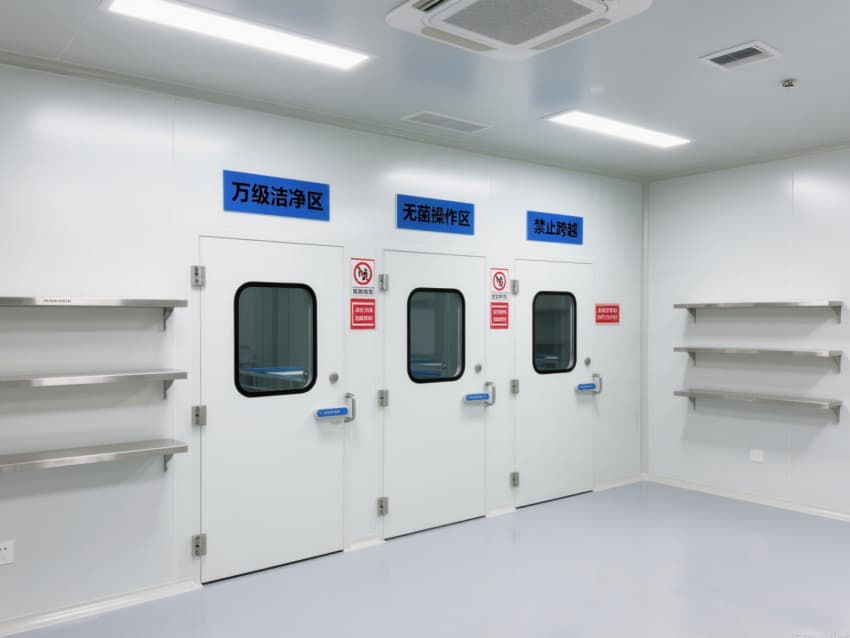 空間內(nèi)配備不銹鋼潔凈門窗與雙扉傳遞窗,均采用高氣密性密封結(jié)構(gòu);嵌入式LED潔凈燈提供300-500lux均勻照明,無眩光設(shè)計保障操作精度。恒溫恒濕系統(tǒng)精準(zhǔn)控制溫度(20-24℃)、濕度(45-60%),藍(lán)色功能標(biāo)識線清晰劃分操作動線,全方位營造安全、穩(wěn)定的萬級無菌環(huán)境。