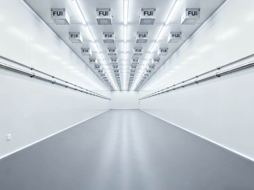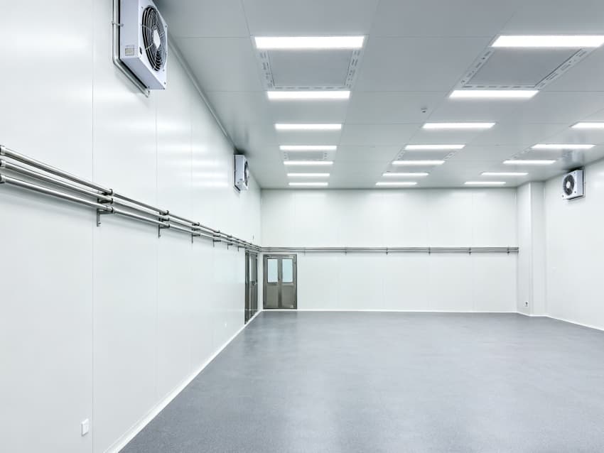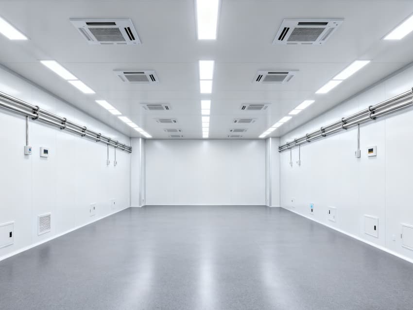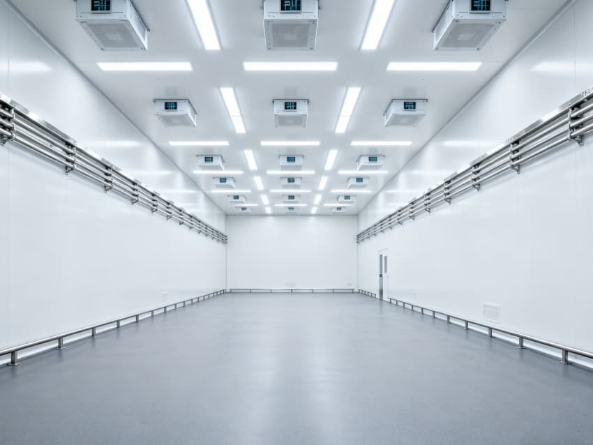 內部6個生產車間均為無設備空曠布局,按百級潔凈標準建設:地面鋪設防靜電環(huán)氧自流平,墻面采用無顆粒潔凈彩鋼板,陰陽角做R30圓弧處理杜絕積塵;柱網(wǎng)間距設為9米,預留光刻機、晶圓檢測設備等重型設備安裝點位;頂部整合恒溫恒濕系統(tǒng)、高效空氣過濾器及防頻閃LED照明,所有管線暗藏于吊頂內,最大化釋放空間高度,為芯片晶圓制造、封裝測試等核心環(huán)節(jié)提供超潔凈、高穩(wěn)定的專屬生產環(huán)境。