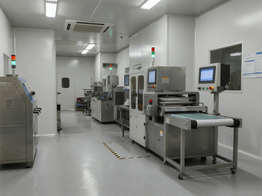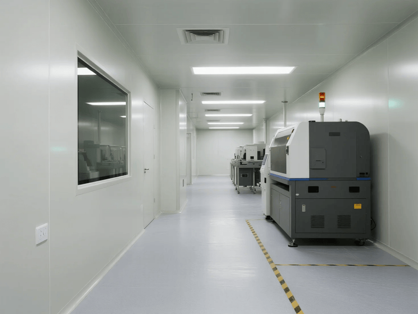 圍護(hù)系統(tǒng):50mm厚白色抗菌彩鋼板墻體,接縫采用無縫焊接工藝,配合R30mm圓弧收邊,確保無粉塵積聚死角;