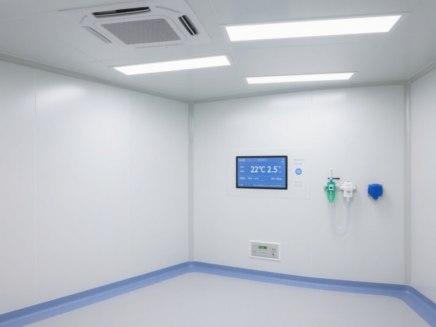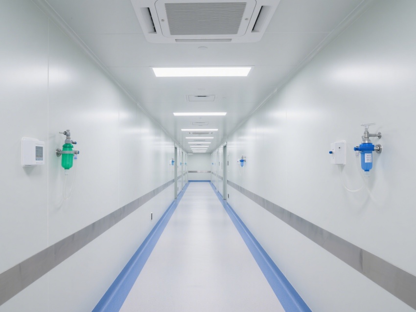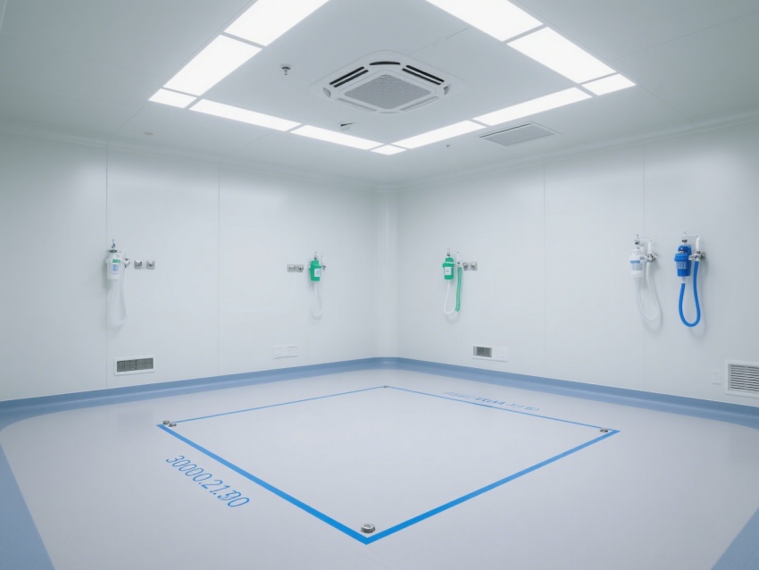 該醫(yī)療無(wú)塵室是為醫(yī)療診療與精密操作打造的專(zhuān)業(yè)潔凈空間。室內(nèi)以白色為主調(diào),搭配藍(lán)色標(biāo)識(shí)系統(tǒng),墻面、地面采用無(wú)縫抗菌材質(zhì),便于清潔消毒,有效防止微生物與灰塵污染。